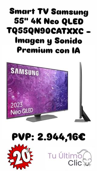 Preciosa Smart TV Samsung 55" 4K Neo QLED TQ55QN90CATXXC, con imagen y sonido premium con IA. - Modelo 2023. - Resolución 4K. - Tecnología Neo QLED. - Incluye un soporte. Eficiencia, diseño y tecnología se unen en la Samsung Neo QLED 55” 4K. Mando SolarCell, optimización de energía con IA y un perfil ultrafino que transforma tu salón en un cine en casa. #SamsungTV #SmartTVNeoQLED #Televisor4K #APlusRenovables #TuUltimoClic #Viral #ParaTi #Samsung55Pulgadas #TVEficiente