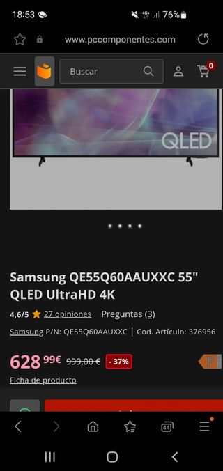 Ojo! La TV es la Samsung Qled 65' TQ65Q80DATXXC, pero la app no me permite poner esta marca. Funciona perfectamente. Comprada en la web de Samsung. Nos resulta muy grande para nuestro salón. En garantía. Casi sin uso.