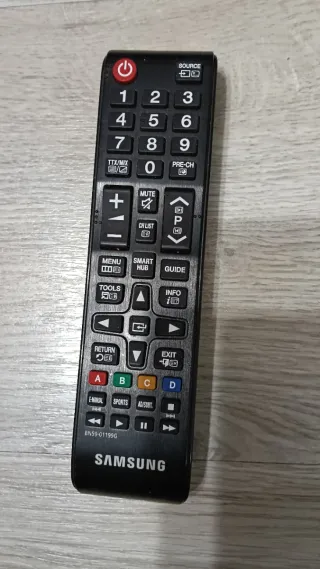 Mando a distancia original para televisores Samsung. - Modelo: BN59-01199G - Color: Negro - Botones: Fuente, números, menú, Smart Hub, guía, herramientas, información, retorno, salida, control de volumen y canales, reproducción, pausa, avance y retroceso rápido, y botones de colores (A, B, C, D). - Incluye botón de encendido/apagado.