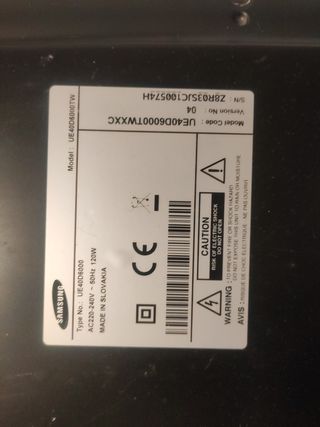 Televisor Samsung UE40D6000 de 40 pulgadas. Modelo con Smart TV. - Tipo: UE40D6000 - Alimentación: AC220-240V ~ 50Hz 120W - Fabricado en Eslovaquia - Código de modelo: UE40D6000TWXXC - Versión: 04 - Número de serie: Z8R03SJC100574H