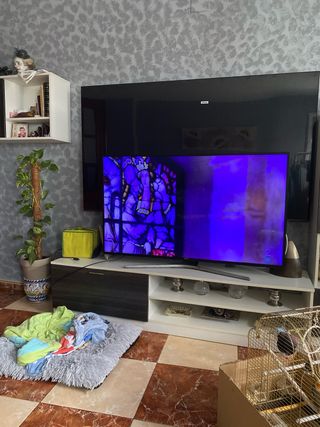Televisión de pantalla plana. - Color negro. televisión de 75 pulgadas, más altavoces y bombo todo samsung funciona todo perfectamente la tele con el mando y Smart TV es del año pasado, es una pasada de television. solo la tele 720