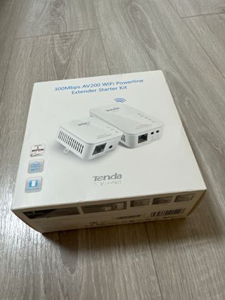 Adaptadores PLC Tenda PW201A + P200 Extender Starter Kit (con WiFi). En buenas condiciones estéticas y de funcionamiento. Ideal para llevar la conexión de internet, a través del cableado eléctrico, a otro punto de tu hogar / empresa. El kit se compone de dos adaptadores, uno que se conecta junto a tu router y otro en el lugar donde se desee llevar la conexión de internet (Smart TV, consola, ordenador, etc.). Velocidad de transmisión: hasta 200 Mops Tomas Ethernet: 1 + 1 RJ45 (100 Mb) Estándar WiFi: Wi-Fi N (300Mb)