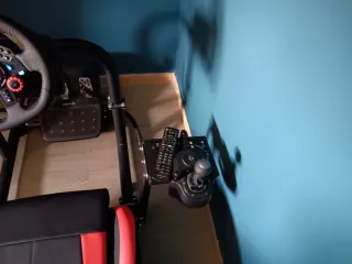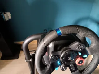 Volante de simulación Logitech. - Diseño ergonómico. - Acabado en cuero. - Anillo azul decorativo.vendo volante, pedales, palanca asiento ajustable yo mido 1.70 y me va muy bien también incluyo la televisión de 50 pulgadas no es Smart TV