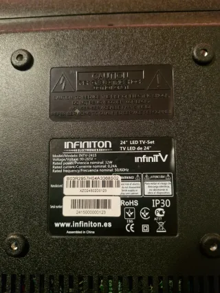 Pantalla de televisión Infinitton en color negro. Se puede hacer Smart tv. Tiene todavia el plástico protector en la base. - 24" y LED - Base estable para colocarla en cualquier superficie.