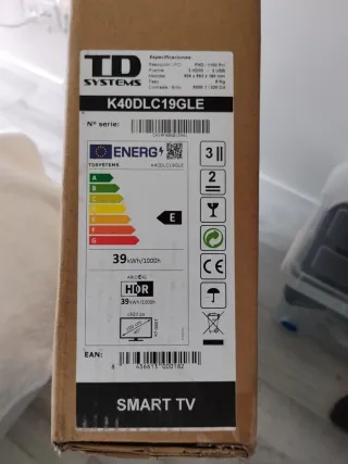 Sin estrenar Televisión TD Systems de 40 pulgadas con resolución Full HD. - Resolución: FHD/1100 PCI - Puertos: 3 HDMI, 2 USB - Medidas: 904 x 563 x 180 mm - Peso: 6 Kg - Contraste: 5000:1 - Brillo: 220 Cd - Eficiencia energética: Clase E - HDR: Sí - Smart TV: Sí
