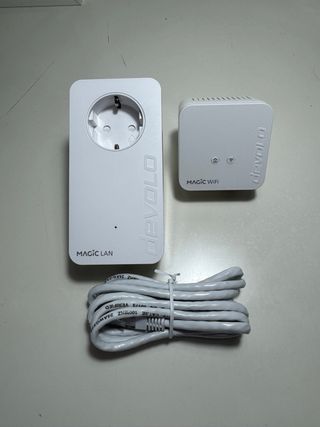 PLC Devolo Magic 1 WiFi en estado nuevo, sin uso. Ideal para mejorar la cobertura de internet en casa llevando la conexión a cualquier habitación a través de la red eléctrica. Perfecto si el WiFi no llega bien a dormitorios, despacho o plantas superiores. Solo hay que enchufarlo y empezar a usarlo, sin configuraciones complicadas. ✔ Conexión rápida y estable mediante PLC ✔ Amplía el WiFi fácilmente ✔ Compatible con routers de cualquier operador ✔ Ideal para teletrabajo, Smart TV, streaming o gaming 📄 El manual se puede descargar desde la web oficial de Devolo. Palabras clave: PLC, repetidor WiFi