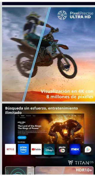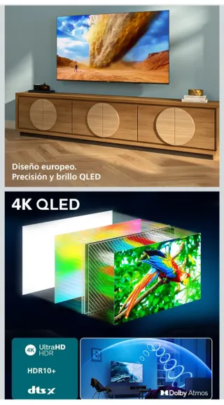 Televisor Philips de 50 pulgadas con tecnología 4K QLED. Disfruta de una experiencia visual inmersiva con colores precisos y un brillo excepcional. ERA PARA UNA PERSONA MAYOR Y NO HA LLEGADO A USARSE. - Diseño europeo. - Precisión y brillo QLED. - Resolución 4K Ultra HD. - Compatible con HDR10+. - Sonido DTS:X y Dolby Atmos. SI