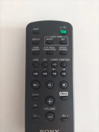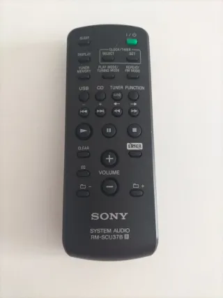 Mando a distancia original para sistemas de audio Sony. - Modelo: RM-SCU37B - Botones: SLEEP, DISPLAY, TUNER MEMORY, USB, CD, TUNER FUNCTION, CLOCK/TIMER, SELECT, SET, PLAY MODE/TUNING MODE, REPEAT/FM MODE, BAND, CLEAR, EQ, VOLUME (+/-), ENTER. - Funciones de reproducción: Play/Pause, Stop, Avance/Retroceso rápido. - No incluye pilas . - Funciona correctamente y garantizo su estado.