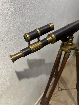 Este telescopio artesanal está fabricado en latón y viene acompañado de su trípode. - Telescopio de latón. - Trípode de madera y latón.