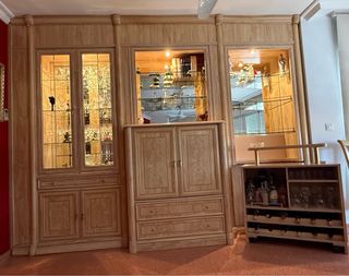 Mueble de salón de madera con vitrinas de cristal y compartimentos. Son tres modulos individuales tipo buaseri. Tiene un pequeño desperfecto en una de las zonas de abajo de un módulo - Diseño elegante en madera clara. - Vitrinas de cristal y espejos con iluminación. - Compartimentos para almacenaje, mueble para televisión y botellero. - Mesa de centro a juego con el mueble de cristal