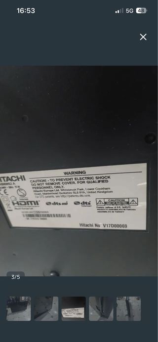 Televisor Hitachi de 50 pulgadas, ideal para piezas o reparación. Presenta un diseño elegante en color negro. - Pantalla de 50 pulgadas. - Modelo V17000069.