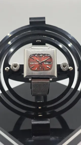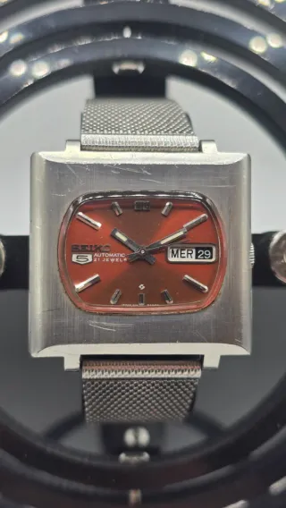 Reloj Seiko 5 automático original de los años 70, una etapa muy representativa de la relojería japonesa, cuando Seiko apostó por diseños atrevidos y formas poco convencionales. Este modelo destaca por su icónica caja tipo “TV”, muy característica de la estética setentera y cada vez más buscada por coleccionistas. La esfera presenta un tono rojo oscuro con acabado sunburst que cambia según la luz, aportando mucha personalidad al conjunto. ✔ Movimiento automático Seiko de 21 rubíes ✔ Caja de acero inoxidable tipo TV ✔ Esfera original en tono rojo oscuro ✔ Día y fecha a las 3 ✔ Cristal en buen estado