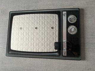 Este espejo decorativo tiene un diseño único que evoca la nostalgia de los televisores antiguos. - Marco negro con detalles plateados. - Superficie reflectante con un patrón circular. - Botones decorativos en el lateral.