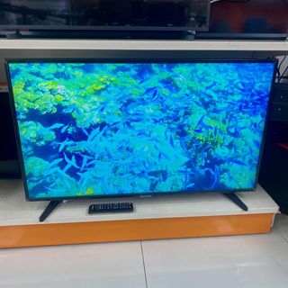 Televisión de pantalla plana con un diseño moderno. - Marco delgado. - Soporte plateado. - Pantalla de 43 pulgadas.