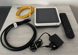 Decodificador Movistar UHD TV con conexión Wifi. - Diseño moderno en color negro y blanco. - Indicadores luminosos frontales. - Logotipo de Movistar visible. - incluye mando a distancia - cable ethernet - cable Hdmi