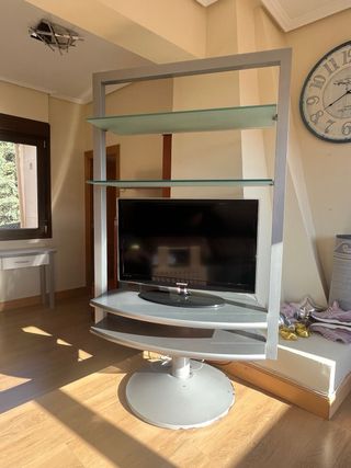 Mueble de TV giratorio con baldas decorativas. - Diseño moderno y elegante. - Estructura principal en metal. - Baldas superiores de cristal. - Base giratoria - Medidas Mueble: 1m ancho x 58cm fondo x 1,74m alto y fondo de baldas de cristal 35cm - Tiene algo desconchada la pintura en alguna zona, sería pintar de gris esas pequeñas zonas, por lo demás está muy cuidado.