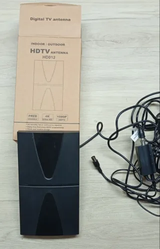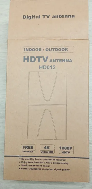 Antena para televisión digital, apta para uso en interiores o exteriores. Modelo HD012. - Compatible con canales gratuitos. - Soporta resolución 4K Ultra HD. - Admite señal 1080p HDTV. - Diseño moderno y compacto.