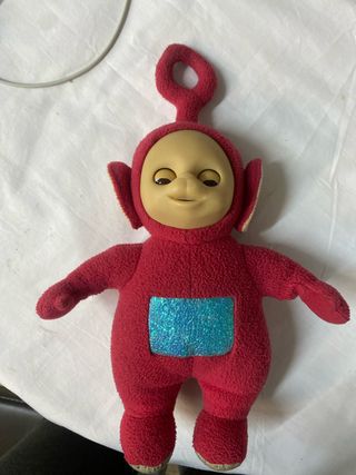 Peluche antiguo del personaje Tinky Winky de los Teletubbies. Es un muñeco suave y de color rojo. - Cara de plástico. - Pantalla azul brillante en el abdomen. - Antena en forma de bucle en la cabeza.