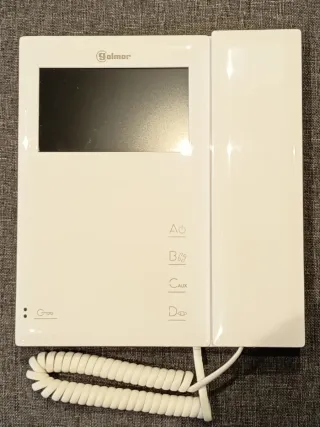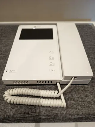 Videoportero de la marca Elcom en color blanco. - Pantalla integrada. - Botones de función. - Cable en espiral.