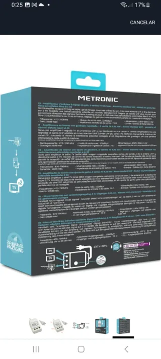 Amplificador de TV Metronic con filtro 4G LTE 800. - Ganancia de 26 dB. - Conexiones de entrada y salida. - Diseño compacto.
