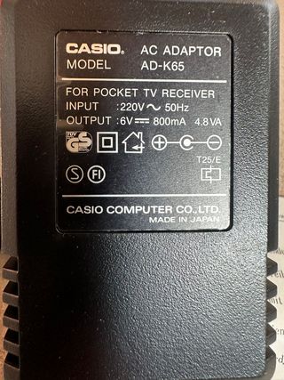 Adaptador de corriente alterna original Casio. - Modelo: AD-K65 - Voltaje de entrada: 220V ~ 50Hz - Voltaje de salida: 6V DC 800mA - Diseñado para receptores de TV de bolsillo. - Disponibles 13 unidades. Descuento si te las llevas todas.