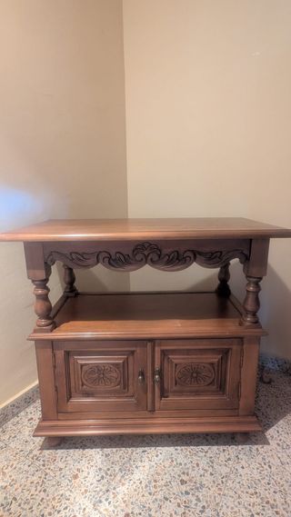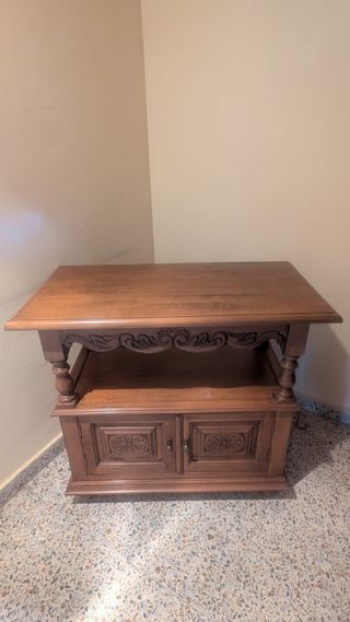 Mesa de madera maciza con un diseño clásico y elegante. Perfecta para colocar tu televisión y otros aparatos. - Acabado en madera oscura. - Dos puertas con tiradores. - Estante inferior. - Detalles tallados.