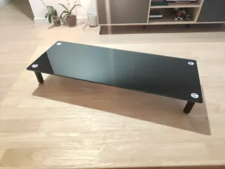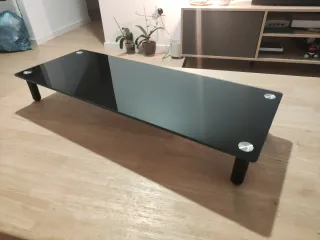 Soporte elegante de cristal negro para TV o pantalla. - Superficie de cristal templado. - Patas negras cilíndricas. - Diseño moderno y minimalista. Medidas en las fotos
