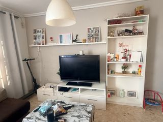 Conjunto de muebles para salón, ideal para organizar tu espacio. - Mueble bajo para televisión con cajones y compartimentos. - Estantería alta con varios estantes para exposición y almacenaje. - Diseño moderno y funcional. Tiene un cajon despegado pero se puede arreglar Los muebles no van unidos se pueden separar Urge su venta por mudanza antes del domingo