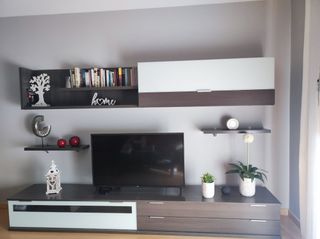 Precioso mueble de salón de madera y cristal, ideal para organizar tu espacio. Se encuentra en buen estado, con algunos signos normales de uso. - Diseño clásico y elegante. - Amplio espacio de almacenamiento. - Combina madera oscura y cristal transparente. - Perfecto para cualquier salón.