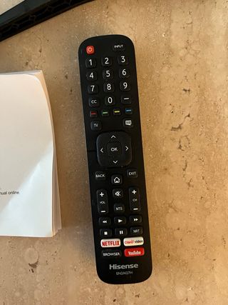 Conjunto de accesorios para televisión Hisense. - Mando a distancia. - Dos patas para soporte. - Guía de inicio rápido.