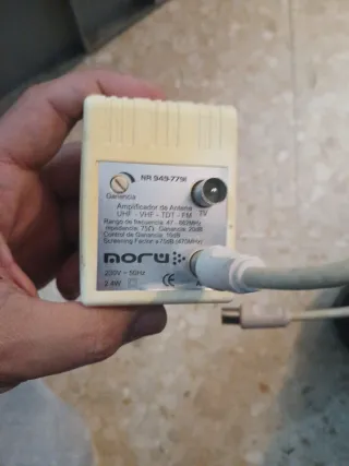 Amplificador de antena para señal de TV, TDT, FM y radio. - Modelo: NR 949-7791 - Rango de frecuencia: 47-862MHz - Impedancia: 75Ω - Ganancia: 20dB - Control de Ganancia: 10dB - Factor de apantallamiento: ≥75dB (470MHz) - Alimentación: 230V ~ 50Hz, 2.4W