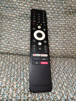 Mando a distancia para Smart TV Thomson. Diseño moderno y ergonómico. - Botones de acceso directo a YouTube, Netflix, Prime Video, Disney+ y Google Play. - Control de volumen y navegación intuitivo. - Micrófono integrado para comandos de voz.