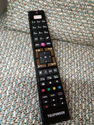 Mando a distancia para Smart TV de la marca Telefunken. Diseñado para un fácil acceso a tus aplicaciones favoritas. - Botón dedicado para Netflix. - Teclas de navegación y control de volumen. - Diseño ergonómico.