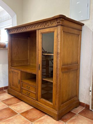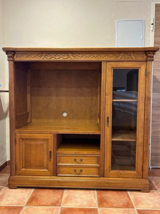 Se vende conjunto de salón compuesto por dos vitrinas + mueble de televisión, fabricado en madera maciza. Muebles sólidos, con muy buena presencia y diseño clásico atemporal. • Puertas de cristal, estilo elegante • Amplio espacio de almacenaje (estantes + cajones) • Mueble TV con zona para dispositivos • Acabado en tonos marrones cálidos • Muy buen estado, bien cuidados Se pueden vender por separado. Ideal para salón, comedor o despacho.