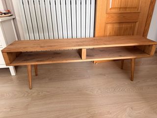 Mesa de televisión de madera maciza natural con diseño moderno y patas cónicas. - Dos compartimentos abiertos. - Acabado en madera clara. - 140cmx30cm Sin uso.