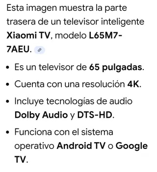 Televisor inteligente Xiaomi de 65 pulgadas, modelo L65M7-7AEU. - Resolución 4K. - Tecnologías de audio Dolby Audio y DTS-HD. - Sistema operativo Android TV o Google TV. • tiene la pantalla rota, es para piezas. No se hace envío,al poder ser Zaragoza, se entregará en mano. No tiene el mando.