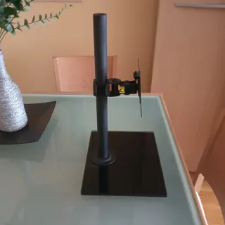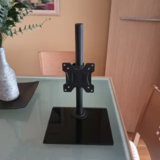 Soporte de mesa para monitor PC o TV. Su diseño moderno y elegante se adapta a cualquier espacio. - Base de cristal negro templado. - Columna y soporte VESA negros. - Giratorio en inclinación y ajuste de altura. - Está nuevo.