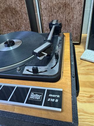 Tocadiscos vintage Bettor 210 S con diseño clásico. - Controles de volumen, balance, graves y agudos. - Selector de mono/estéreo. - Velocidades de reproducción 33, 45 y 78 RPM. - Fabricado en España.