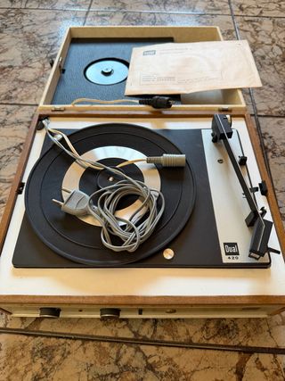 Tocadiscos portátil Bettor Mark 4 con brazo Dual 410. Un diseño clásico y funcional. - Plato giratorio. - Controles de graves, agudos y volumen. - Brazo de lectura Dual 410. - El plato gira y el altavoz conecta pero no saca sonido. - Necesita puesta a punto pero funciona.