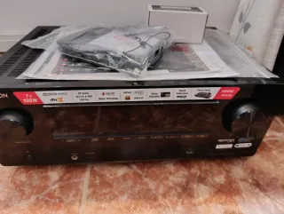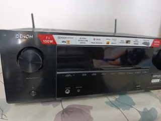 Amplificador AV Denon en color negro, con 7 canales y 150W por canal. En su embalaje listo para entregar Preferible en pesona no cambios ya no tienes garantía de fábrica - Compatible con Dolby Atmos y DTS:X. - Soporta video 8K, 4K/120 y VRR. - Incluye HEOS para streaming de música. - AirPlay 2 y Bluetooth integrados. - Asistente de configuración y calibración de sala Audyssey. - Entrada Phono para tocadiscos.
