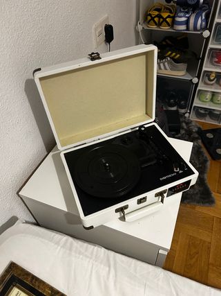 Tocadiscos portátil con diseño de maletín. Esta como nuevo pero no funciona, esta para reparar - Acabado exterior en blanco. - Plato giratorio negro. - Asa para facilitar su transporte.