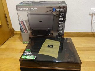 Tocadiscos Muse MT-108 BT con altavoces de madera. Incluye su caja original. - Conexión Bluetooth. - Puerto USB para codificación y reproducción MP3. - Función Auto Stop. - Diseño vintage. Está en perfecto estado salvo la tapa, que está rayada y una patilla un poco partida, de ahí el precio. Pero su funcionamiento es perfecto
