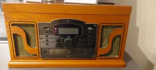 Sistema de audio multifunción con acabado en madera. - Reproduce vinilos, CDs y casetes. - Sintoniza la radio. - Conexión USB. Incluye mando a distancia. Se vende porque me he comprado un equipo nuevo y apenas está usado.