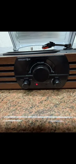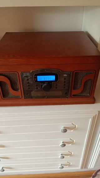 Tocadiscos con un diseño clásico y elegante. Lo he disfrutado mucho, pero nos regalaraon otro y no necesitamos dos. - Acabado en madera de tono marrón. Estilo retro. - Tocadiscos en la bandeja superior. - Radio y reproductor de CD y Cassetes.