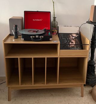 Mueble de contrachapado con compartimentos para organizar tu tocadiscos y colección de vinilos. Cuenta con un diseño moderno. Trae un pequeño picotazo con el que venía de fábrica. Aparece en las fotos. Se encuentra en un tercero sin ascensor.