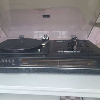 Equipo de sonido vintage con tocadiscos, radio AM/FM y reproductor de cassette. - Tocadiscos con selector de velocidad 33/45/78 RPM. - Radio AM con dial de sintonización. - Reproductor de cassette con funciones básicas. - Controles de volumen, graves y agudos. - Salida para auriculares.