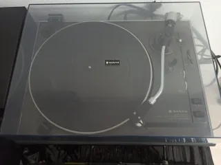 Sistema de audio Hi-Fi compacto de la marca Sanyo. - Plato giradiscos. - Reproductor de casetes. - Sintonizador de radio. - Controles deslizantes y botones. - Diseño elegante en color negro y plateado.