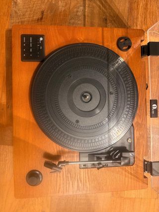 Tocadiscos de la marca 1byone. Esteticamente esta bien, funciona el motor y gira el plato, pero el brazo está mal compensado y no reproduce bien los vinilos. Se vende como está, para reparar o piezas. Perfecto para quien quiera repararlo.