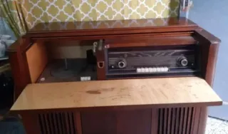 Mueble de madera, el mueble esta impecable con radio válvulas y altavoces, para restaurar - Diseño clásico y elegante. - Compartimento para tocadiscos. - Panel de radio con dial y botones.