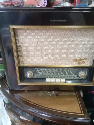 Radio antigua de la marca Telefunken. - Tocadiscos ( no funciona) - Diseño clásico y elegante. - Panel frontal con dial y botones. - Altavoz cubierto con tela decorativa.